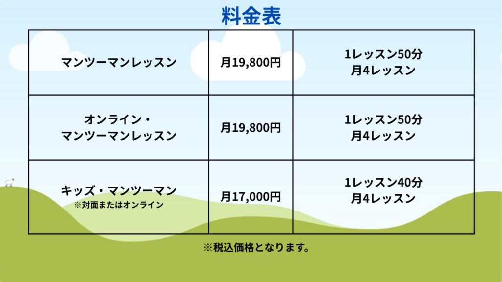 日常英会話/ビジネス英語/旅行英会話/ワーキングホリデー/留学準備/発音矯正/キッズ英語/英検対策/TOEIC対策など